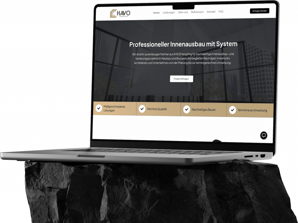 Für die Havo Projektbau GmbH, ein Unternehmen im Bereich Innenausbau und Trockenbau, wurde eine kompakte und moderne OnePager-Website entwickelt. Ziel war es, die wichtigsten Leistungen und Kompetenzen des Unternehmens klar darzustellen und potenziellen Kunden eine schnelle Möglichkeit zur Kontaktaufnahme zu bieten.